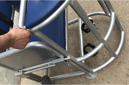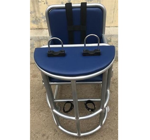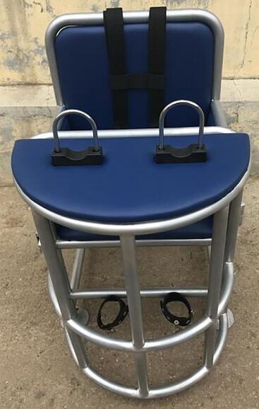 此款审讯椅铁管制作,电镀银色,座椅前端设有方形小桌整体开关的一些装置,其桌面上方装有U型锁具,方便约束其手腕,下方设有约束带。具有头、手、脚、身的一体防御功能,既有效防止嫌疑人的反抗、脱逃、自残等行为发生。靠背、座面、桌面采用西皮软包。结构设计合理,全缝焊接,坚固耐用。