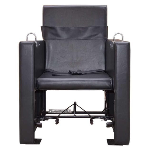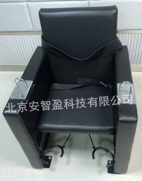 4、特性:审讯椅手部采用U型锁约束,U型锁下按至合适位置将嫌疑人手部锁住,扶手部位宽度便于签字书写;胸部及腰部以约束带束缚;腿部以环形脚踏锁,jing员在椅后用脚踏可将锁打开,嫌疑人小腿置入,踩踏锁上,操作方便。