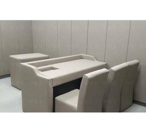 基材是由聚乙稀发泡棉组成,外包材是由经过B1级阻燃处理2mm厚皮革, 常规尺寸是1.25米*2.45米*2公分厚、1.25米*2.45米*3公分厚常规尺寸,其他尺寸可以根据改造需要规划、因为基材为密闭孔发泡式结构,具有出色的抗压抗击打能力,“安智盈”审讯室防撞软包具备的防撞能力也是众多材料难以企及的,同时由于这种无理结构特性,也使得软包具有吸音系数0.95以上的吸音能力。
