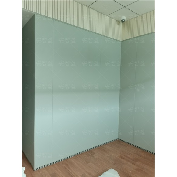 基材是由聚乙稀发泡棉组成,外包材是由经过B1级阻燃处理2mm厚皮革, 常规尺寸是1.25米*2.45米*2公分厚、1.25米*2.45米*3公分厚常规尺寸,其他尺寸可以根据改造需要规划、具有良好的防水性能,其芯材聚乙稀是密闭孔结构,不吸水,检测等级合格。“安智盈”因为基材为密闭孔发泡式结构,具有出色的抗压抗击打能力,“安智盈”审讯室防撞软包具备的防撞能力也是众多材料难以及的,具有良好的防撞性能,其弹性是普通海绵软包、玻璃棉软包的10倍,受到撞击会自行还原。阻燃防火等级B1级,在长达20秒的火焰点燃下,未发现燃烧迹象,未产生大量黑烟。环保E0级,未检测到甲醛释放,实现零甲醛释放,未检测到其他有毒有害物质释放散发挥发。同时由于这种无理结构特性,也使得软包具有吸音系数0.95以上的吸音能力,以此广泛应用于谈话室、审xun室、办案区场所。