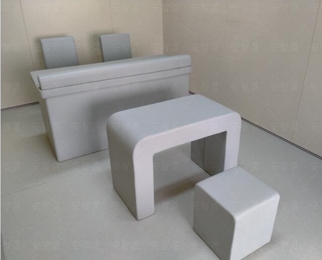 问话室软包桌椅结构为多层实木板为主体,弹性结构:高密度防火纳米棉,面层皮革:阻燃皮革防