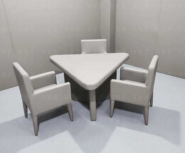 谈话室防撞软包墙面主要是使用新型环保隔音防撞墙,谈话室三角桌取义公平,方便大家公平沟通,所以纪委谈话室的谈话桌一定是三角形的,