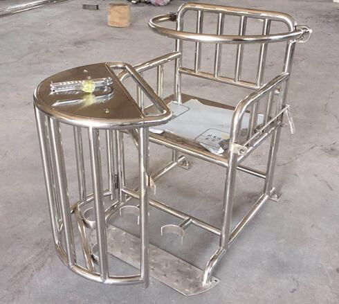 本产品匀选用标号为国*标201优*质不锈钢材料,包括靠背、座面、椅腿、扶手及胸部约束环另外包括座椅前设有整体弧形开关装置。其桌面上方装有U型锁具,方便约束其手腕。椅腿下方装有直接与地面固定底盘。