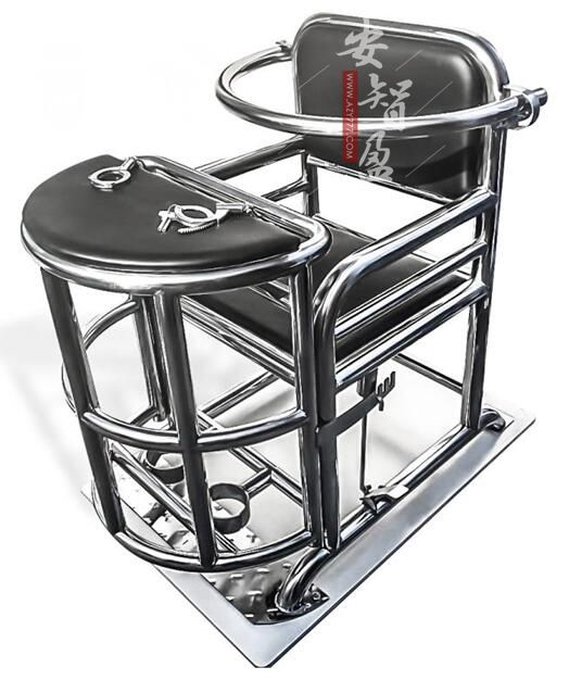 操作: 轻踩左下方的小踏板,桌框门自动弹开将犯罪嫌疑人关至本器械,关上弧形桌框门就可以将犯罪嫌疑人脚部约束,弧度大小有3个档位,可根据人的体型选择合适档位,然后把胸部固定带关至适合档位,打开桌面手kao把犯罪嫌疑人手腕放至内,调节至适当档位即可