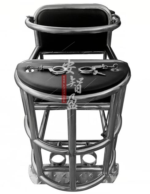 kao,方便约束其手腕。台板下方为笼式框架,与台板成一体,可限制目标人腿部运动范围,腰部有不锈钢约束环。靠背、座板、台板用海绵覆皮革成软包。椅腿下方装有直接与地面固定底盘。