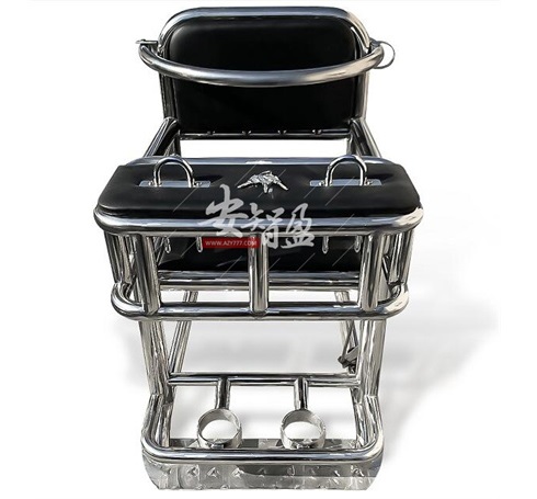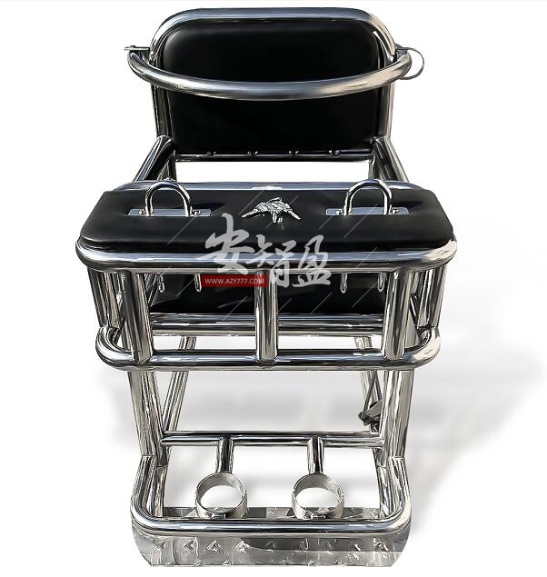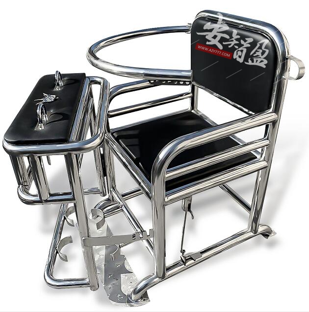 3、结构:讯问椅由座板、靠背、台板、扶手、腰环、U型锁kao、脚环等组成,台板下方为笼式框架,与台板成一体,可限zhi目标人腿部运动范围,腰部有不锈钢约束环。靠背、座板、台板用海绵覆皮革成软包。椅腿下方装有直接与地面固定底盘。
