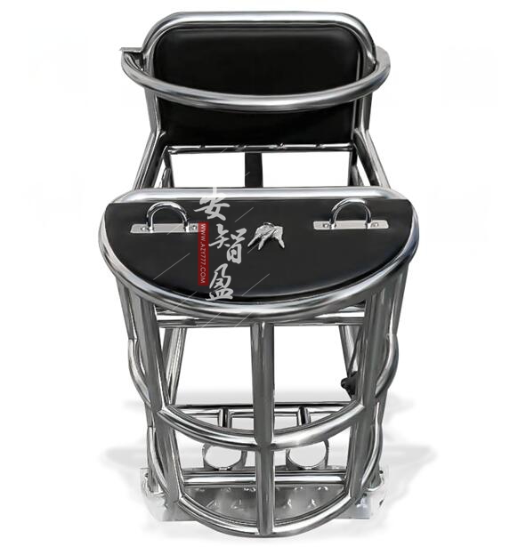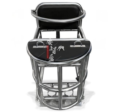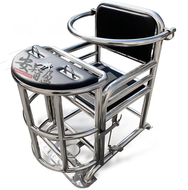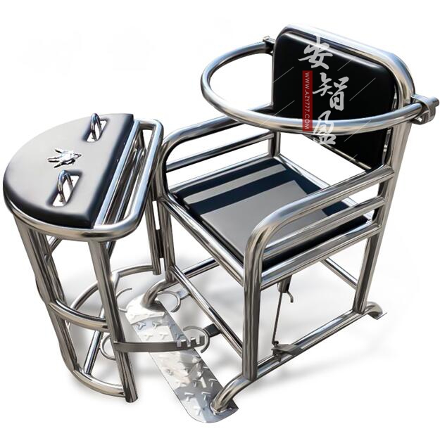 3、结构:讯问椅由座板、靠背、台板、扶手、腰环、U型锁kao、脚环等组成,台板下方为笼式框架,与台板成一体,可限制目标人腿部运动范围,腰部有不锈钢约束环。靠背、座板、台板用海绵覆皮革成软包。椅腿下方装有直接与地面固定底盘。