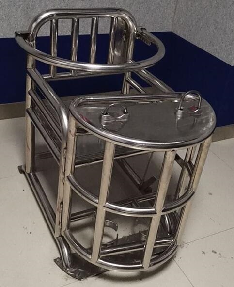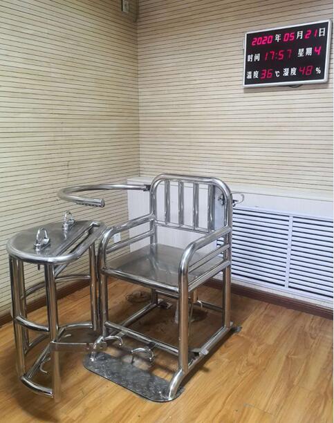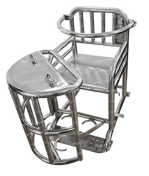 审讯椅桌面上方装有U型锁*具,方便约束其手腕,下部为脚环装置。腰部有安*全杠,防止头部前倾。