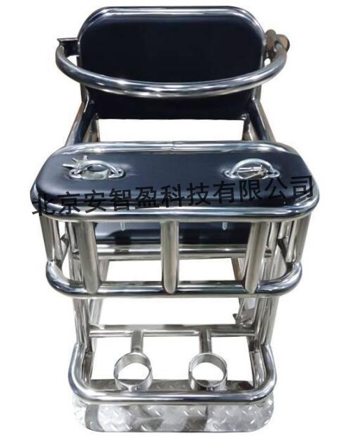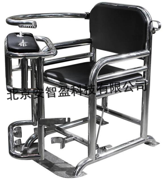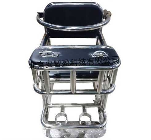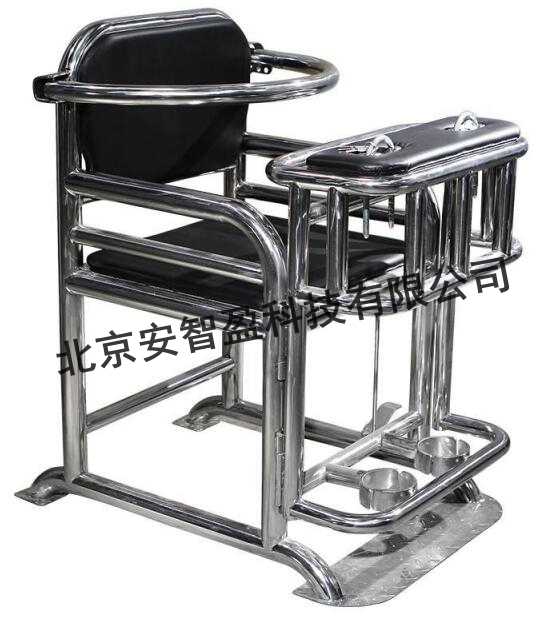 3、结构:讯问椅由座板、靠背、台板、扶手、腰环、U型锁kao、脚环等组成,台板下方为笼式框架,与台板成一体,可限制目标人腿部运动范围,腰部有不锈钢约束环。靠背、座板、台板用海绵覆皮革成软包。椅腿下方装有直接与地面固定底盘。