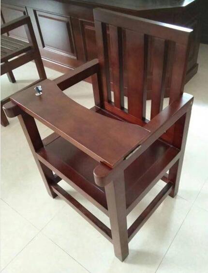 椅子采用实木支架,基材采用全实木,经高温沸煮及脱水达到定型后不开裂,不变形。面板油漆采用环保油漆,达到环保标准。审讯椅各棱角处为圆滑处理。可固定于地面。