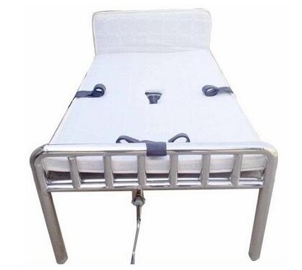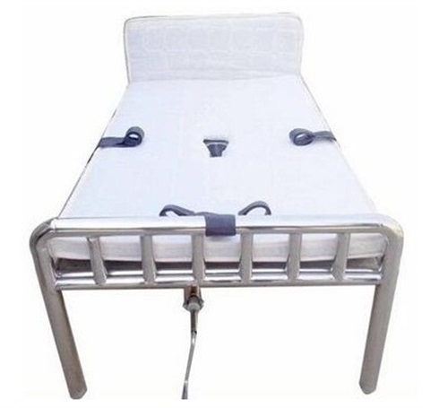 不锈钢材料制作,床垫颜色有白色和军绿色,手脚均可固定,上半身和腿部可调节角度,既舒服又不易逃脱。可升降。不锈钢床头、二折约束床含束带含床垫。