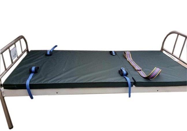 该约束床包括床架、固定于床架上的床板,床板上根据患者躺卧的足踝部、手腕部、胸部位置分别固定有约束带。本实用新型结构合理、科学,使用方便、安*全、有效,亦可称为“保护床”,主要用来对兴奋、冲动、伤人、毁物、自杀、自伤、违拗、治疗欠合作的病人和毒瘾发作的戒毒人员进行约束,在其对自身或者周围安全造成影响时加以干涉,避免意外发生。