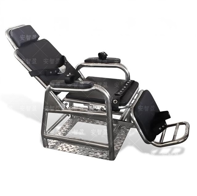 一款新型醒酒椅,部,脚部,胸部,腿部分别设有约束带,约束带采用磁扣式约束带,被醒酒人员不易划伤和脱落,方便办案人员开启,可躺角度150度左右,脚部采用人性化设计,可把脚放在上面慢慢躺下。加装了头部位置,比普通醒酒椅更加人性化,可固定地面