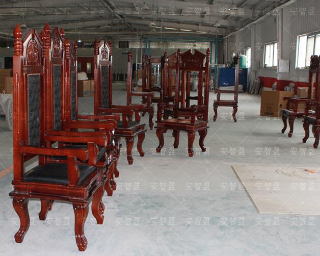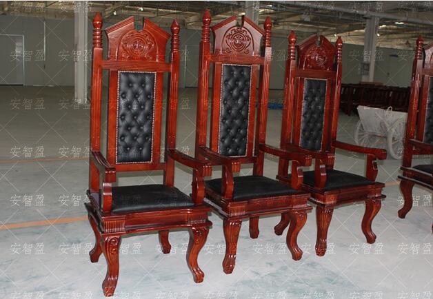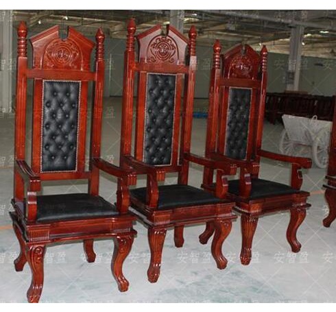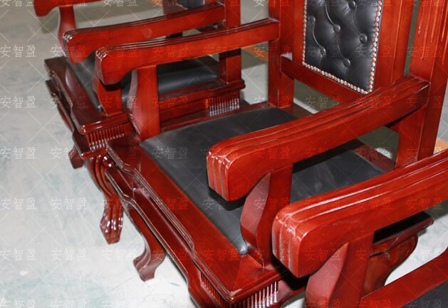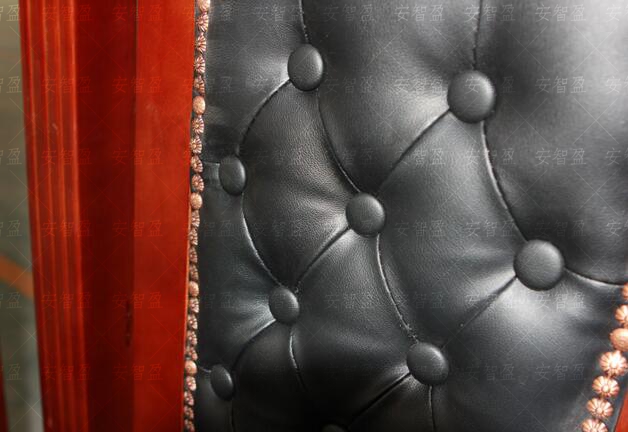 靠背及坐垫:采用软包工艺。靠背上部中间为实木雕刻天平图案装饰构件、靠背上部两侧采用实木栏杆式装饰构件。