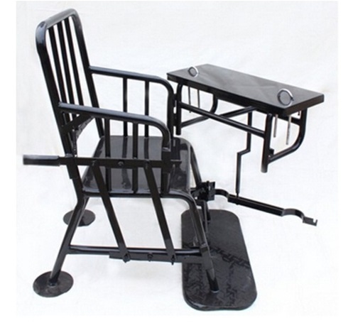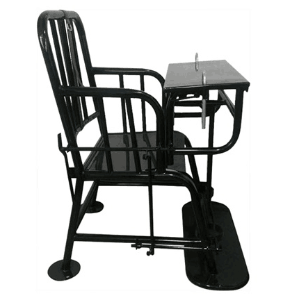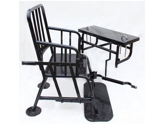 新型审讯椅采用上层铁艺,座椅前端设有方形小桌整体开关的一些装置,下部设有腿部固定装置,固定安