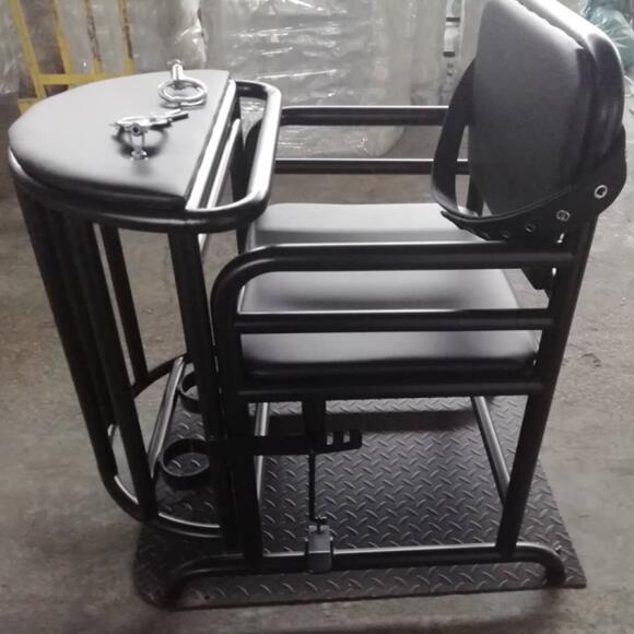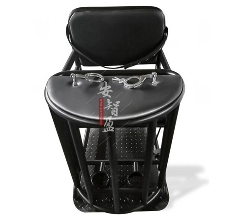 11.操作方法:轻踩左下方的小踏板,桌框门自动弹开将犯罪嫌疑人关至本器械,关上弧形桌框门就可以将犯罪嫌疑人脚部约束,胸部有约束带固定,可根据人的体型选择合适档位,然后把胸部固定带关至适合档位,打开桌面把犯罪嫌疑人手腕放至手kao内固定。